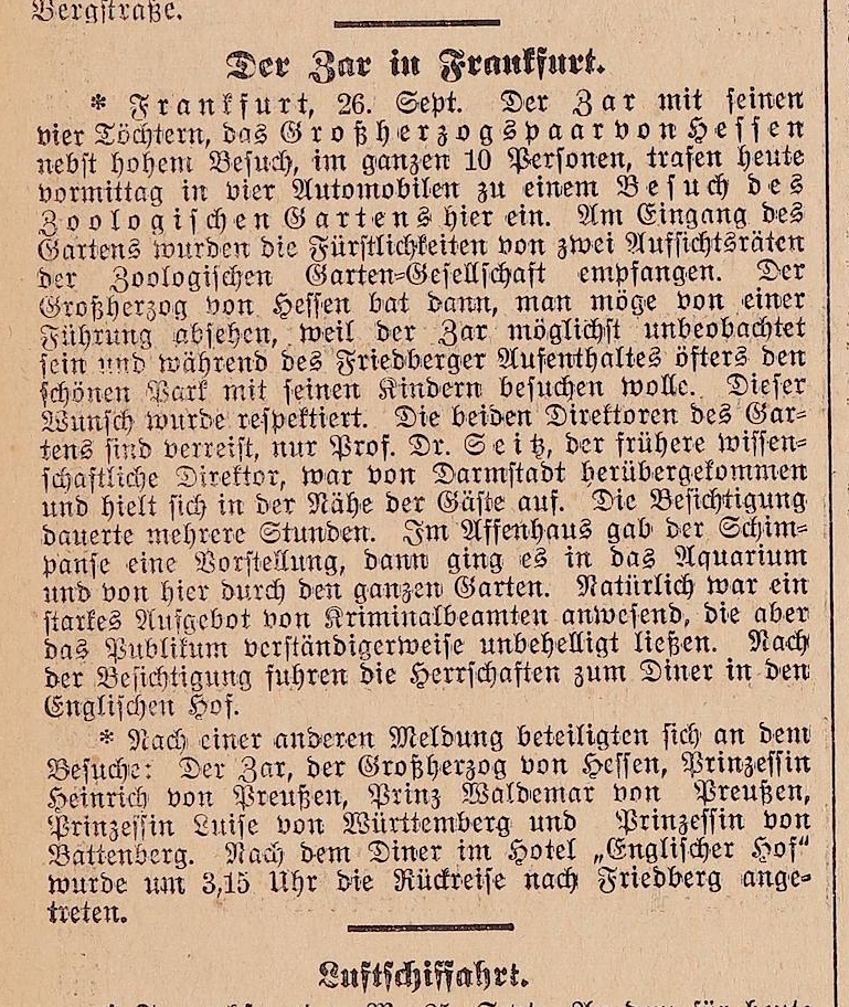 Abfahrt des Zaren am 14. November 1910, siehe auch diesen und diesen Artikel in der Darmstädter Zeitung von 15. November 1910